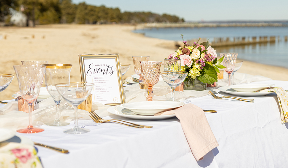 Thinking about your seating at an outdoor wedding is critical. If there’s no overhead shelter and your outdoor setting has direct sunlight, chances are that your guests will feel very uncomfortable sitting on basic white resin chairs. Consider your wedding theme in selecting seating as well as the environment. Consider chairs that have fabric pads or settees for alternate seating options. Also, while farm tables are totally trendy, select seating based on how long your guests are expected to stay seated if ordering wooden benches. A great alternative is to mix and match chairs for the visual appeal and consider padding for a comfortable guest experience.